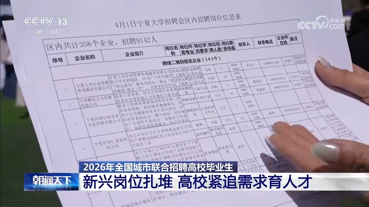 央视网动静:2026年全国城市结合聘请高校结业生春季专场勾当4月1日启动,也鞭策着高校加速改变人才培育模式。沉点培育复合型人才。来看记者4月1日从现场发还的报道。能源化工和新材料的岗亭占了42%,告竣初步就业意向3048人。人工智能、数字经济等新兴范畴需求兴旺,从我手中的聘请岗亭消息表能够看出,校企同步发力,